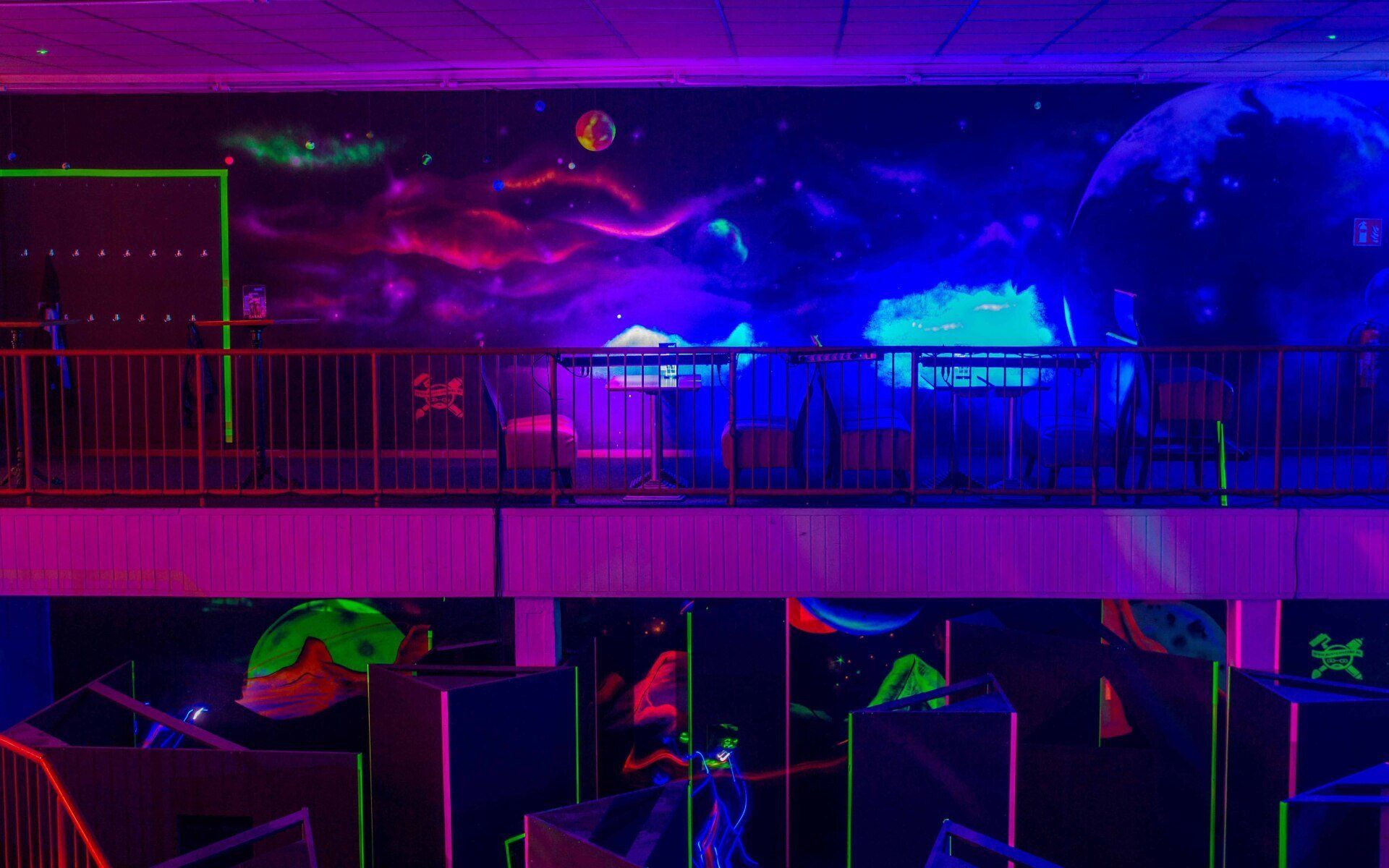 Das gesamte Bewegungsfeld ist in Schwarzlicht und leichten Nebel getaucht. Durch fluoreszierende Farben und Lichteffekte sind die Wände und die Lichtsignale der Phaser zu sehen. Ein atmosphärischer Soundtrack verstärkt den futuristischen Eindruck.