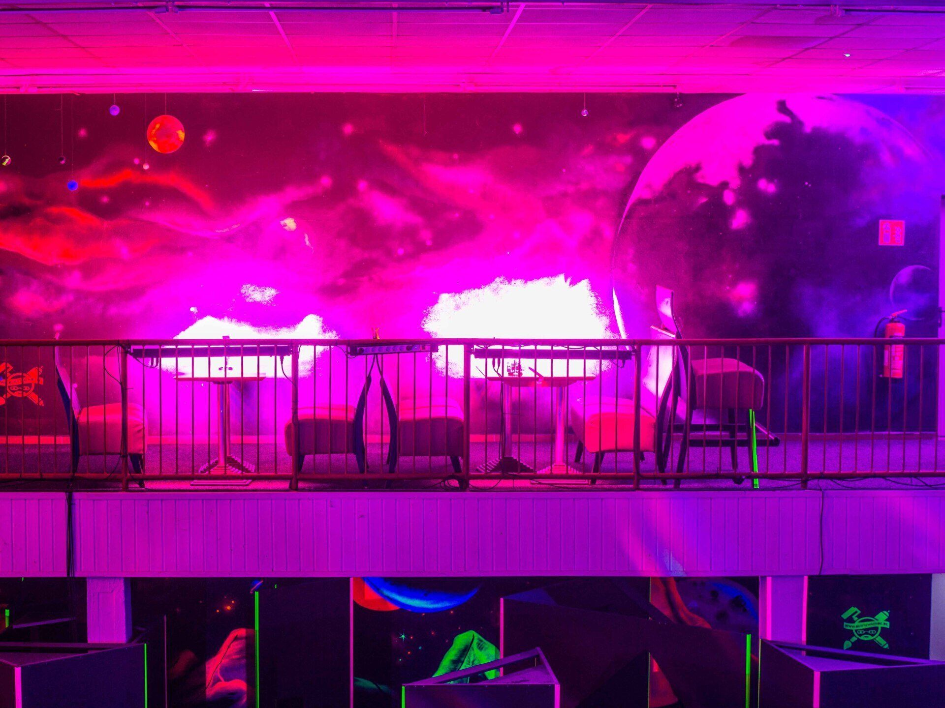 Das gesamte Bewegungsfeld ist in Schwarzlicht und leichten Nebel getaucht. Durch fluoreszierende Farben und Lichteffekte sind die Wände und die Lichtsignale der Phaser zu sehen. Ein atmosphärischer Soundtrack verstärkt den futuristischen Eindruck.